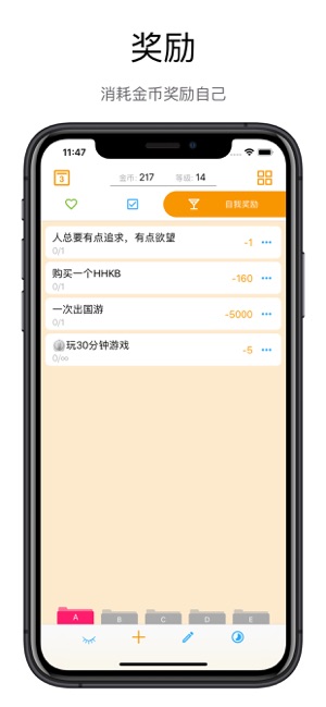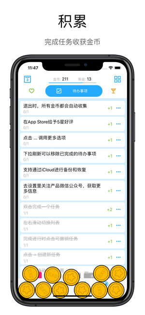 像玩游戏一样工作和学习。让你每一个小小进步都有收获。完成每日目标或待办事项可获得金币,花费金币可进行自我奖励。 基本操作 * 双击完成一个普通任务。 * 双击开启一个计时任务。 * 长按后拖动调整任务顺序。 * 左右滑动切换列表。 * 完成进行时点击可撤销任务。 * 点击 + 创建新任务。 * 点击 ... 调用更多选项。 * 使用iCloud备份和恢复。 * 在设置中可以进行更多个性化配置。 习惯 这里写上你想培养的习惯,比如 6点前起床,23点前睡觉,每天健身30分钟,每周洗三次头等。同时为每个习惯标上一个合适的金币值,完成习惯就可以获得相应的金币。具体数值可以以时长作为衡量标准,比如…