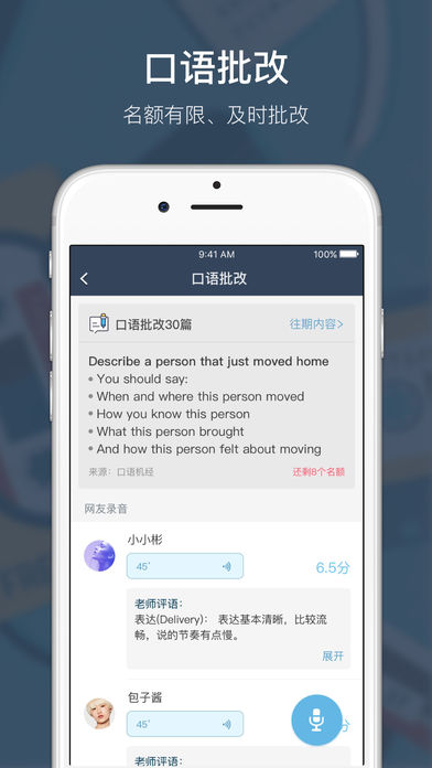 小站雅思,雅思听力口语雅思阅读写作提分利器。提供剑桥雅思完整听力阅读练习,口语真题题库,真人口语一对一模考,新增雅思名师微课堂分享名师干货,是小站留学系列APP之一,免费提供雅思口语批改,被网友称为最有效的良心“烤鸭“神器。我们致力于为大家提供最权威的学习服务和最优秀的软件体验(*^__^*)。 功能介绍 【剑桥雅思题库】 剑桥雅思4—12题库,最佳的手机做题体验加丰富的解析,刷题不费劲~ 【剑桥雅思精听】 听力精听精练,变速,单句播放,雅思听写好伴侣。 【口语全真模拟1对1练习】 模拟雅思口语考试流程,选取雅思高频口语真题,与考官1对1对话,训练考试语境,备考也动真格儿的! 【雅思名师大咖微课堂】 小站雅思名师大咖公开课,与你面对面分享雅思学习中的各种干货精华。 【免费雅思口语批改】 口语练习模考没有批改怎么行,小站雅思特聘前雅思考官,为您提供免费口语批改服务。 【口语写作真题题库,口语写作机经】 高命中机经收录,精选雅思口语写作真题,定义考频,分类练习,定期更新。 【阅读听力口语写作全科分类】 分类练习,有目的有针对性的刷题。 【支持查单词 生词收藏功能】 支持查单词,并可添加到生词本随时温习复查,轻松搞定不熟悉单词,背单词再也不盲目! 你造吗!小站雅思是小站留学系列APP之一,小站托福APP上线后就荣登AppStore搜索榜首,受到广大考生的一致好评。未来会有更多更精彩优秀的多元化内容呈现给大家哦~~敬请期待哦,小编一口气说了这么多,其实就是想告诉大家,小站雅思是一款高端大气上档次、低调奢华接地气,简约时尚国际范的雅思备考神器。有了它,包您“考鸭”无忧。走过路过不要错过哦,如果您喜欢,就请 伸出食指,在屏幕下方的评论处,为小站雅思APP点个赞吧!亲,爱你哦o(∩_∩)o 小站雅思的全体童鞋们期待您的反馈 鉴于App Store里不能直接回复,您可以登录软件点击【个人中心】-【给我们意见】,留下您的宝贵意见和联系方式,方便我们联络到您。 您也可通过以下方式反馈: 新浪微博:@小站雅思app 微信公众号:留学OfferU QQ群:565035089