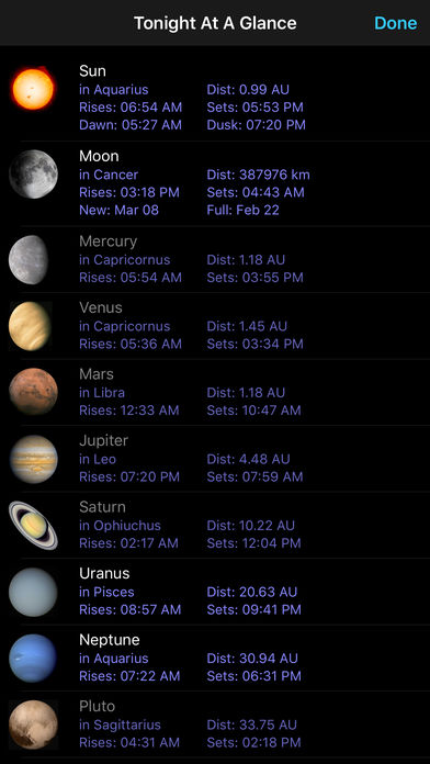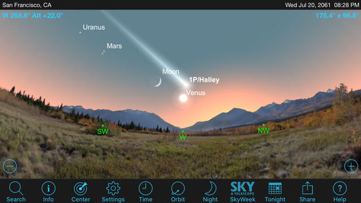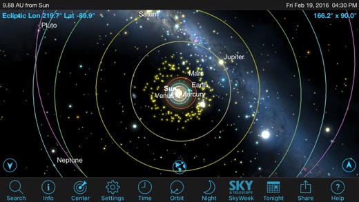 SkySafari 5 is the newest version of the world's best astronomy app!! If you've used an older version of SkySafari, here's what's new: 1) Complete support for iOS 9 & 10! 2) Support for Apple Watch! Everything you need to know about the Sun, Moon, Planets, and ISS on your wrist. 3) Tonight at a Glance: the location and rise/set times of the Sun, Moon, Planets, and International Space Station in one handy view! 4) Notifications when the ISS and other major satellites will pass overhead, and when the planets rise! 5) Completely new sound effects, and a new look to the sky and horizon. A brighter, more visible Moon. Better transitions between portrait and landscape mode. 6) Object lists in the Search menu now show thumbnail images for every object which has a photograph, and also now shows their rise/set times. 7) Updated object descriptions, now with images in-line on iPhone and iPod touch! Every object now has a description! 8) A new Share button lets you share your sky by email, text, or social media! 9) Reworked Time Flow controls, which let you set the date and time directly from the main toolbar. If you haven't used SkySafari before, here's what you can do with it. • Hold your device up, and SkySafari will find stars, constellations, planets, and more! The star chart updates automatically with your real time movements for the ultimate stargazing experience. • See an eclipse now, in the past or in the future! Simulate the night sky from anywhere on Earth many years in the past or in the future! Animate meteor showers, comet approaches, transits, conjunctions, and other celestial events with SkySafari’s Time Flow. • Locate the Sun, Moon, or Mars from our extensive database and track the arrow to be directed to their exact locations in the sky before you. See spectacular views of Venus, Jupiter, Saturn, and other planets! • Learn about the history, mythology, and science of heavens! Browse from hundreds of object descriptions, astronomical photographs, and NASA spacecraft images in SkySafari. Explore tons of NASA Space Missions! Stay up-to-date with SkyWeek, for all major sky events every day – miss nothing! All this is built into SkySafari 5 – no need for an Internet connection. It's a powerful planetarium that fits in your pocket, puts the universe at your fingertips, and is incredibly easy to use! This app is everything the casual stargazer will ever want. Additional Features: • 120,000 stars; over 200 star clusters, nebulae, and galaxies; all major planets and moons, and dozens of asteroids, comets, and satellites including the International Space Station (ISS). • Animated meteor showers with complete viewing information & spectacular graphics. • Orbit Mode – Leave the Earth’s surface behind, and fly like a NASA space probe through the solar system. Requires in-app purchase. • Night Vision – Preserves your eyesight after dark. • Apple Maps Integration – Choose your location from a built-in Maps view. • Horizon Panoramas – choose from beautiful built-in vistas, or customize your own! For telescope control, a bigger database, and more features, check out SkySafari 5 Plus and SkySafari 5 Pro!