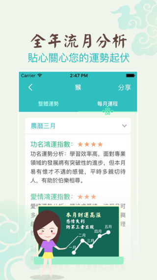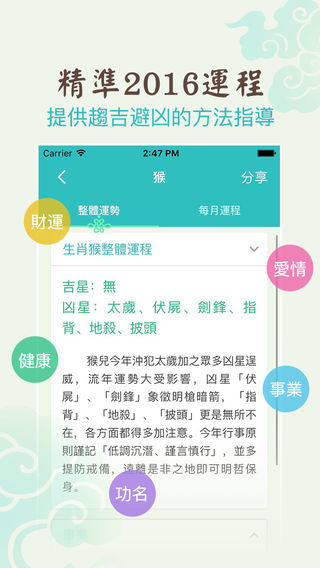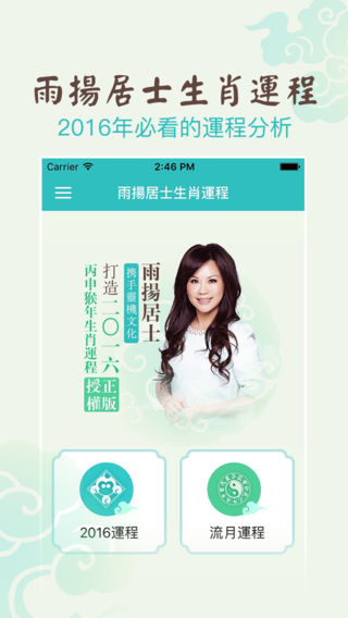2016年生肖运程开运宝典强势来袭!! 资深媒体命理大师雨扬居士倾力指导!!! 【应用特色】 1、整体运程:2016整体运势如何?透过吉凶星位,预知先机,趋吉避凶行大运! 2、运程详解:猴年运程详细解析,事业、财运、健康、爱情运势,一目了然! 3、流月分析:大师指导每月运程,助您猴年顺风顺水、事事顺心! 4、生肖运势:十二生肖面面俱到,2016好运必备指南! 【大师介绍】 雨扬居士:第一位将命理与科技结合的命理大师,第一位与台湾雅虎奇摩合作大师亲算,专业命理学家,中医学博士,现任雨扬慈善基金会创办人、雨扬科技事业群执行长、台北市云林同乡会理事。一生研究儒佛道文化思想,精通八字、阳宅风水、易经卜卦等中国传统学说,目前已累积五十余本着作。近年来更投身慈善公益与弘扬佛法,帮助人们脱离痛苦、走出迷津,进而知命、造命,转换成正面能量,实现开心即是开运的人生,曾登上日本杂志封面,被誉为幸福领航者。 【雨扬居士2016生肖运程】是雨扬居士与灵机文化强强合作的2016开运宝典,除了有传统的生肖运程详解之外,还增加了由雨扬居士总结多年经验,并经过改良的独家特色开运方法,助您2016年在财运、事业、爱情等诸多方面行大运、行好运! 【品牌支持】 灵机文化是全球知名的传统文化整合传播平台,与上百位知名的命理老师合作,致力于为大家提供更加精准的命理知识和命理应用。 【联系我们】 網 站:http://m.linghit.com/ 新浪微博:灵机妙算 Facebook: https://www.facebook.com/linghit 网易博客:http://gzding.blog.163.com/ 微 信:灵机妙算lingjimiaosuan
