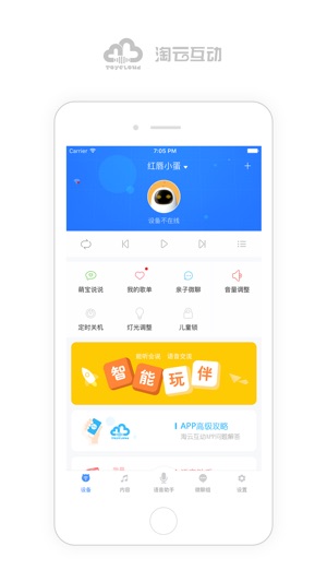 【APP简介】 "淘云互动"是一款基于家庭亲子关系、可以结合智能玩具的儿童学习与社交的APP。 1.组建微聊组,亲子沟通、全家同乐! 2.可以在微聊组中绑定各种智能设备,宝宝只要用玩具就可以与家长互动哦! 3.丰富的正版早教资源。在APP里可以听故事、听儿童,宝宝和家长喜欢的内容应有尽有。 4.可以将宝宝喜欢的故事儿歌第一时间收藏起来,想听的时候随时播放。 【我们的愿景】 让宝宝“玩中学、学中玩”,快乐成长每一天! 【联系方式】 http://www.toycloud.com