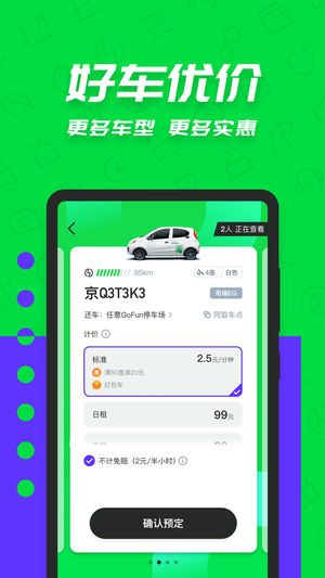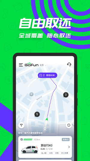 比共享单车更潮的GoFun共享汽车来了! 现在注册即享1元用车3小时优惠! GoFun出行是首汽集团旗下的汽车分时租赁智能共享平台,与首汽租车、首汽约车同属首汽移动出行板块的兄弟公司,致力于为现代都市生活提供一种更简单、更智能的出行方式——共享汽车。 GoFun出行特点: 7*24小时服务,按需智能共享用车,每天出门不限行,行业领先的用户身份识别技术,安全性爆表! 比打车更便捷,比公交更自由,比租车更简单,比单车更舒适,这就是属于你的未来的出行方式——首汽GoFun共享汽车。 北京、上海、青岛、厦门、武汉、成都、长沙、南京、西安、佛山、广州、宁波、天津、昆明、桂林、三亚、合肥、乐山、无锡、大…