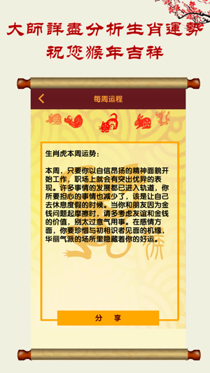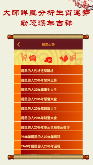 猴年运势,性格命理运程解析,一次下载全年不愁 2016猴年最全运程及流年破解大全,十二生肖运势攻略之王,综合各位大师精华,精准预测分析事业、爱情、财运及健康走势,命中劫数提醒规避。是2016年你必须随身携带趋吉避凶的红宝书!!!内容联网每周都有更新,不断提供最新,最有价值的生肖命理信息及幸运秘籍。 特点: 1、大师详尽分析十二生肖2016流年流月运势,助你猴年吉祥 2、每日黄历提醒,万事皆能如意安排 3、每周都有最新,最有价值的生肖命理及幸运秘籍更新 4、画风古朴典雅,程序简单易用 5、一人下载,轻松通过新浪微博,微信、qq等分享亲朋好友,家人朋友全受益
