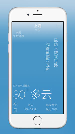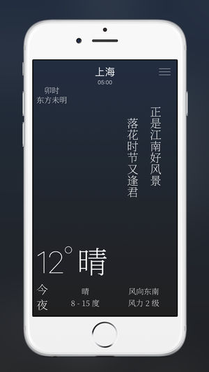App Store「2015趋势盘点」「一元精选专区」推荐; 应用推荐媒体「AppSolution」重点推荐; 「雨时」,为您提供更诗意的查看天气方式。 - 精准的实况天气与未来七天预报,覆盖全国两千五百余市县地区以及全球五万城市; - 任何时间、任何天气都有与之契合的诗词相伴; - 写意的天气背景与动态天气效果;