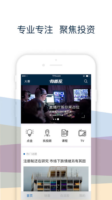 有看投APP 是第一财经旗下集投资咨询、社交和资讯为一体的互联网投资服务平台,平台依托第一财经的资源,汇聚百家金融证券投资理财服务机构、上千投资理财顾问及投资达人,通过“点金”“锦囊”等多种服务模式,为广大个人投资者提供个性化的分析和建议,以提升投资水平。同时,第一财经为平台提供了专业的内容生产和审核团队,全方位把控内容和质量。 在有看投,您可以 (1)参加模拟炒股大赛:和专业的投资顾问以及民间达人同场PK,晒出您的收益,证明自己的实力。 (2)观看交流投资观点:专业投顾和投资达人第一时间发布自己对市场的观察和分析,以及专业的研究观点,您可以关注他们,也可以与他们交流互动。 (3)锦囊观摩:每一位投资顾问和炒股达人,都有着自己的选股策略,择时方法以及风险控制的技巧,锦囊通过让普通用户同步观察锦囊管理者的操作,学习和交流面对瞬息万变的市场,如何更从容专业的应对。 (4)收看节目:第一财经电视包括《今日股市》《谈股论金》《公司与行业》等王牌证券类节目和多档新锐互联网独家自制栏目在有看投上全景呈现,用户可以同步收看直播或自由点播。