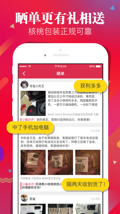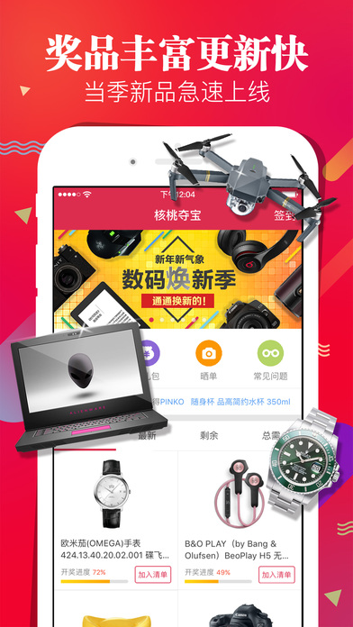 核桃夺宝,众筹购物神器,让你1元把你想要的带回家。 已经有154512个用户在这里中了大奖啦!快来买哦 用了核桃夺宝,再也不用卖肾啦 【实现愿望,只需一元】 无论是奢侈品还是日用品,总有一样你想要的。上百种潮流新品,统统只需1元零钱夺宝,再也不用找什么海淘代购,聚划算! 比彩票高出10W倍的中奖概率,下个幸运儿就是你~一举抢红包中个大乐透 【公平公正】 以“老时时彩”数据作为公正数据源,某期商品售完立即公布数字A,计算数据完全公开,保证了开奖结果绝对公平。最终结果取决于彩票。 【用户心声】 某公司白领:太激动了,本来以为是假的,一下1元中了个电脑,身边的小伙伴们都惊呆了 某大学生:非常感谢小核桃,快递非常快。客服态度非常好,特别耐心,在线客服马上就可以找到他们,点个赞! 某家庭主妇:1元钱买不到什么,在这里可以买一个梦想。我都介绍给我的闺蜜团了 【实现梦想,只要一元】 快过年啦,快来夺个宝哟~一元抢好礼,回家送爸妈送长辈,再也不用什么京东白条啦 有事可以在线直接联系客服哦~ 官方微信公众号:核桃夺宝
