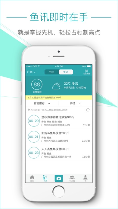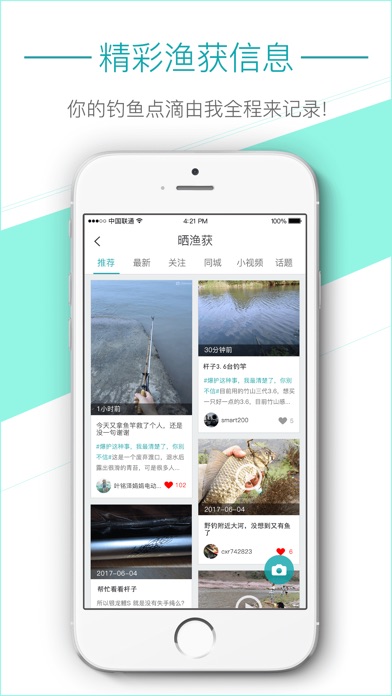 91钓鱼是一款钓鱼人必备上鱼软件,钓鱼发烧友们的交流平台。 朋友圈的钓友都在玩91钓鱼,现已拥有数百万名垂钓爱好者。 钓友在91钓鱼平台直播交来自五湖四海的朋友,分享野钓、海钓、黑坑技巧等钓鱼技巧;晒渔获秀装备,学习钓鱼知识组队钓鱼。 【钓鱼直播】:垂钓大神在直播间边钓鱼边分享钓技钓法,与钓鱼达人互动,向钓鱼大师学习钓技。 【竞技比赛】:钓鱼大师钓技比拼,你是谁的粉丝? 【精彩渔获】:你的钓鱼点滴由我全程来记录,享鱼获晒钓具秀装备,相约钓友于钓场垂钓;分享经验交流进步,共享垂钓乐趣。 【钓场渔具店】:钓场渔具店,一键导航一键联系,找到就是那么容易,尽在身边 【钓友社区】:物以类聚人以群分,这里是钓友专属空间,找同好从未如此简单 结识周边志同道合的钓友,如此简单。 想要入驻91钓鱼?想联系我们?有意见反馈? 微信公众号: 91钓鱼公众号:diaoyu_91 钓鱼圈公众号:diaoyouquan 主播招募微信:diaoyu9191 邮箱:gofishing91@163.com 联系电话:400-8081-691