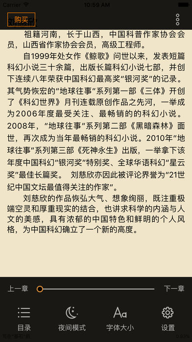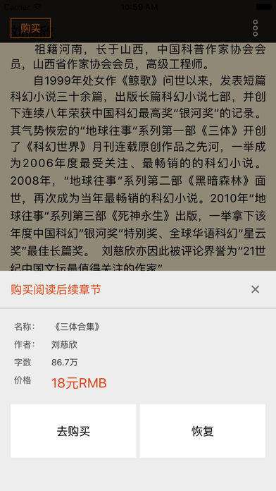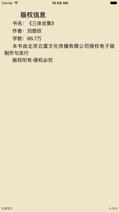 三体-合集 是针对科幻书籍 《三体》系列的 电子书阅读APP。《三体》三部曲(地球往事,黑暗森林,死神永生)被誉为迄今为止中国当代最杰出的科幻小说,是中国科幻文学的里程碑之作,将中国科幻推上了世界的高度。2015年8月23日,《三体》获第73届雨果奖最佳长篇故事奖,这是亚洲人首次获得雨果奖。引用美国著名文学评论家布哈伊·哈桑的话,科幻小说似乎触及了人类集体梦想的神经中枢,解放出我们人类这具机器中深藏的某些幻想。所以当我们被世俗琐事缠身的时候,不妨一起来脑洞大开,《三体》将会带你推开一扇超乎想象的世界大门。