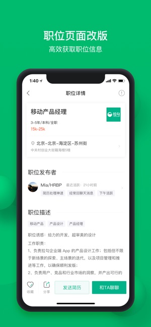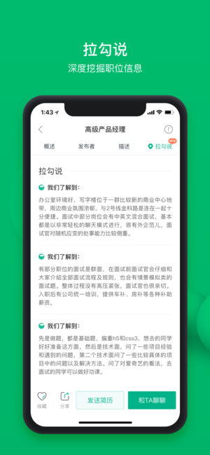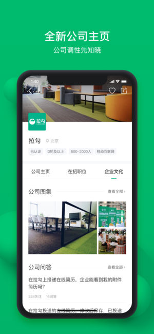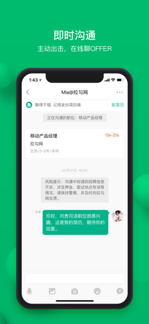 拉勾-互联网人才求职找工作必备APP,企业CEO/业务部门Leader/HR的手机招聘利器,海量职位,精准匹配,极速入职,拒绝等待。 企业招聘、精英求职,一个APP全搞定! 海量高薪职位实时更新,薪资透明,拒绝面议。 求职者与招聘方精准匹配,招聘更专业,求职更快捷。 精英人才可以: 【即时沟通】 被动等待不如在线开聊,和老板直接聊offer; 【投递动态】 随时查看简历投递进度,接收面试通知,好机会不容错过; 【直播live】 参与线上直播,与职场大咖边聊边投高薪职位 【面试评价】 面试后发表你的面试评价,这次轮到你给hr打分; 【隐私设置】 屏蔽企业、匿名显示,细节更贴心,求职更安心;…