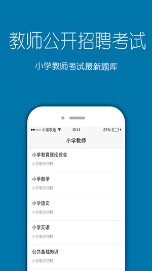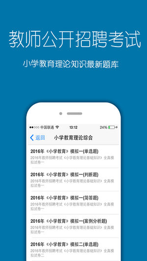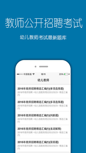 本软件教师招聘考试包括以下内容 特岗教师考试:特岗教师招聘考试,教育心理学,心理学,教育学,理论综合知识,教育法律法规与政策,新课程改革,课程与教学的基本理论与实践 幼儿教师:幼儿教育理论基础知识 小学教师:小学数学,小学语文,小学英语,公共基础知识,小学教育理论综合 中学教师:中学数学,中学语文,中学英语,中学生物,中学政治,中学历史,中学地理,公共基础知识,中学教育理论综合 特岗教师招聘考试 2016年特岗教师考试模拟题(1) 2016年特岗教师考试模拟题(2) 2016年特岗教师考试模拟题(3) 2016年特岗教师考试模拟题(4) 2016年特岗教师考试模拟题(5) ....... 《…