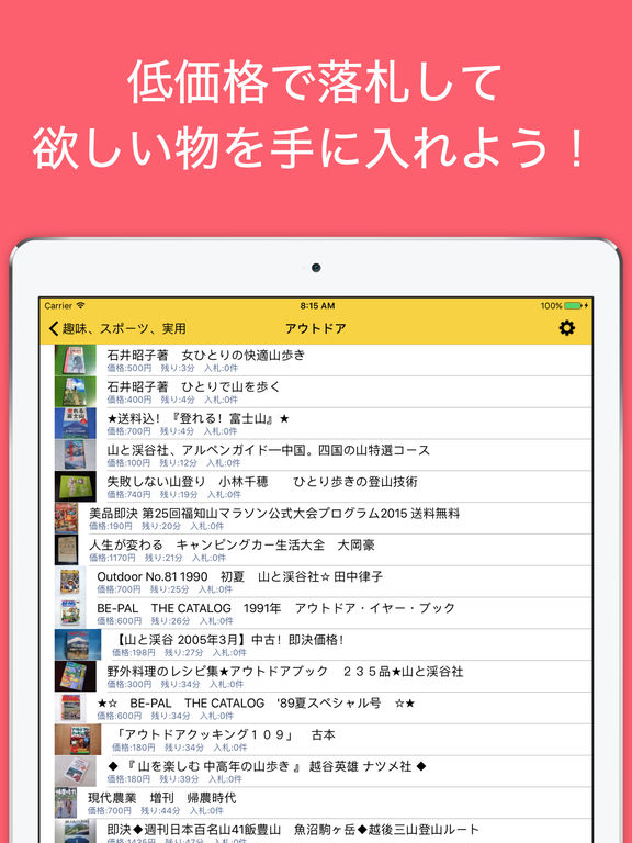 ヤフオクの終了まもなくのバーゲンを発見するための簡単なアプリです。 入札無しで開始価格のままで終了するオークションがたくさんあります。 カテゴリを選択して、あとは一覧するだけです。残り時間と現在価格を自由に設定できます。 ログインは不要で正式なヤフオクのAPIを利用していますので、ご安心いただけます。 最安値価格で落札して商品を手に入れましょう!