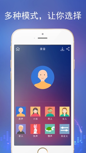 这个应用是一个变声应用,你可以选择让你的声音变的像女声,男声,老人,或者乌龟,兔子。转换你的音调,让它们听起来很搞笑。你也可以把你的声音保存下来逗逗家人或者朋友。 特性: * 包含录音功能,可以直接录制保存音频 * 多种变声模版可供选择 * 支持自定义变声效果 * 可以通过qq,微信,微博发送变声后的声音,或者原始声音