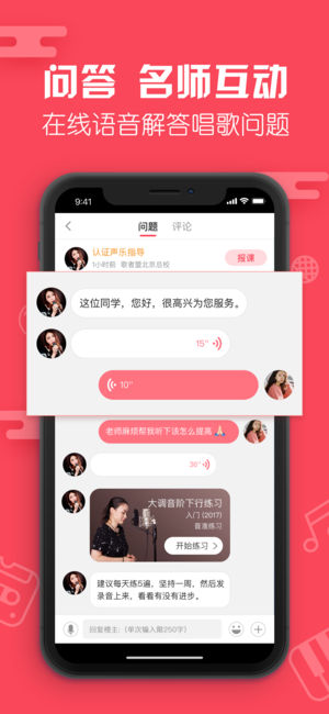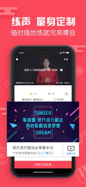 歌者盟-学习唱歌技巧的声乐教学软件,你的随身唱歌教练。 歌者盟是一款学习唱歌声乐技巧的音乐教学软件,可以帮助广大声乐爱好者从零基础开始专业学习现代流行唱法的知识和技巧,通过练习逐渐进行入门提高。科学系统的为您解决高音上不去、低音下不来、气息不够用、音色不好听、唱歌容易累、感情不到位、五音不全等问题,全面提高你的唱歌水平。 『演唱问答』演唱问答模块,您可以用文字、语音等方式向老师提问,也可以发布自己演唱的歌曲求老师点评指导。专业的流行唱法声乐导师会用文字或语音为您耐心讲解,会推荐适合您的练习或训练计划供您练习。支持添加唱吧、全民K歌、酷我K歌、天籁K歌、演唱汇、好唱、VV音乐、欢唱、咪咕爱唱…