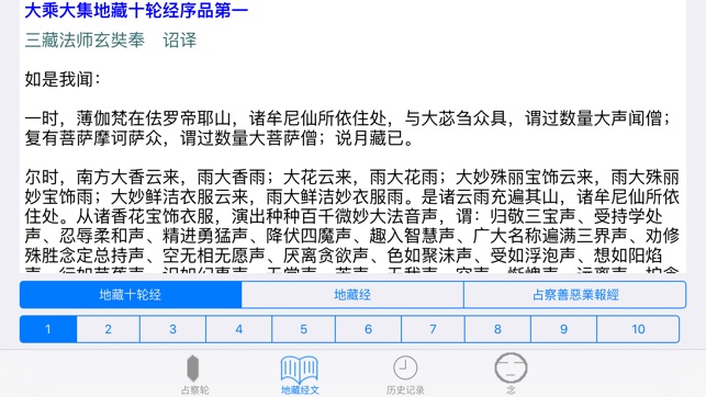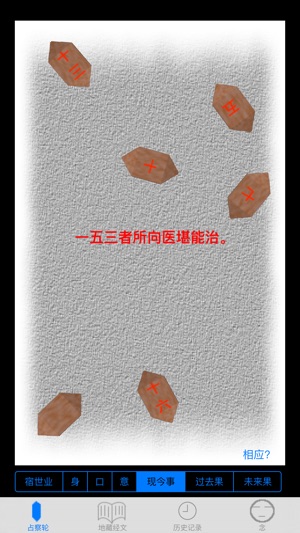 占察轮源自占察善恶业报经,近代以梦参老和尚讲说最力。互联网上有相当资源。 佛教并不提倡求神占卜,而是以自身的修持面对外境,然我等凡夫总随外境障碍,未如菩萨阿罗汉能调伏烦恼,透达因果。甚至修行路上,连障碍都无法看清。木轮占法,提供了俗事事,业报轻重等可作为生活的参考。 此App只是方便法。没有仪轨,拜忏。只有简单念佛。此法重要得是相应,相应于地藏菩萨的悲愿。 掷法:点屏幕,默念所求之事。点或是拖曳至屏幕欲放下的点放开。 三种轮相: 宿事业时,再点选一次,可以选择单掷某些十恶业中的一个。以求过去所作业。 身口意时,再点选一次,选择所掷为何业,善恶以最近一次所求显示。以求善或恶是否相应之前所求善或恶…