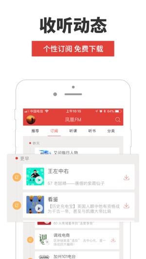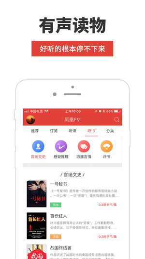 凤凰FM-随时随地聆听世界的声音! 凤凰FM助您解析真相,增长见闻,引发思考,触动人心! 凤凰FM,一个有品质的移动电台!聚焦时下优质内容,及书店畅销读物有声化。来这里,免费听千本高品质的有声书。 上下班路上必备听神器,海量节目,wifi下载不费流量,随时随地,想听什么就听什么!路上堵车再也不无聊了! 【百万用户盛赞】 : 想看小说,但是工作一天眼睛太疲劳怎么办??想听相声评书,没有收听渠道怎么办?想了解时讯,早上上班太急没有时间怎么办?想听笑话段子脱口秀,没人说给你听怎么办?想给宝宝讲故事,没有思路怎么办?想教孩子学习英语,自己不会怎么办?你是否不知道怎么规划你的碎片时间?在上下班…