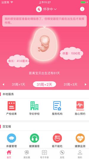 母子健康手册,是一种的全新理念的健康手册。将枯燥无味的纸质书,以多功能应用形式呈现给大家。 · 营养食谱,提供常规饮食、妊娠高血压、妊娠贫血、妊娠重吐、妊娠高血糖等五类人的健康营养膳食食谱 · 在孕妇学校,可以观看学习从妈妈的妊娠到宝宝的出生还有妈妈做月子这整段过程中的一些小知识。 · 在我的日记,妈妈也可以记录一下怀孕期间的心情和一些与宝宝之间的趣事 · 在政策法规中,可以了解到一些与怀孕相关的一些政策及法规 · 宝宝的变化,提供了从怀孕第一天开始到最后一天每一天宝宝的变化。