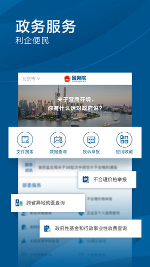 国务院客户端是国务院发布政务信息和提供在线服务的新媒体平台,由国务院办公厅主办,中国政府网运行中心负责运行维护。 国务院客户端现开通要闻、总理、政策、部门、地方、服务、督查等栏目,第一时间权威发布国务院重大决策部署和重要政策文件、国务院领导同志重要会议、考察、出访活动等政务信息,同时面向社会提供与政府业务相关的服务,建设基于新媒体的政府与公众互动交流新渠道。 官方微博:@中国政府网 http://weibo.com/zhengfu 官方微信:中国政府网 zhengfu