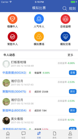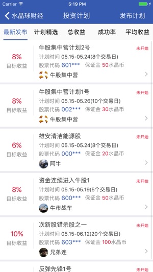 水晶球财经APP----高手云集的自媒体股票社区,一个专注于为投资者提供股市投资交流的社交网站,用户可自由发布股市投资心得、实盘操作等,目前已经聚集了大批炒股高手。用户还可参与模拟炒股比赛、实盘大赛、选股比赛、投资计划等,并跟随炒股高手进行交易。