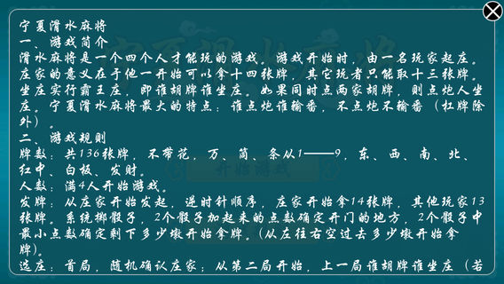 地道的家乡味道,我们的理念是,要让每一个朋友都能在我们的作品中找到自己老家的味道,特别是让那些身在外地,甚至身处海外发展的老乡们,想家的时候消遣娱乐一下,听一听原汁原味的家乡话,打一打地地道道的家乡牌!同时希望愿意体验和尝试宁夏味道的朋友乐在其中!祝愿所有外出的朋友,平平安安显身手;没有外出的朋友,健健康康展宏图! 游戏简介 滑水麻将是一个四个人才能玩的游戏。游戏开始时,由一名玩家起庄。庄家的意义在于他一开始可以拿十四张牌,其它玩者只能取十三张牌。坐庄实行霸王庄,即谁胡牌谁坐庄。如果同时点两家胡牌,则点炮人坐庄。 宁夏滑水麻将流行于宁夏一带,讲究避让吃炮、胡牌算杠等规则,番种简单但玩法多变,广受男女老少喜爱。滑水,即为跟着上家出一样的牌,以避免点炮。宁夏滑水麻将最大的特点:谁点炮谁输番,不点炮不输番(杠牌除外)。