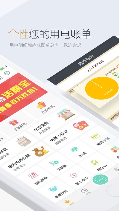 电e宝是集公共事业交费、电力在线服务、金融交易服务于一体的民生服务云平台,服务全国上亿用户,给您的生活充满电! 【一站式智能交费】 1、电费代收代扣 提供多种类、便捷、安全的支付方式,满足您全天候交费需求,给您提供全方位的电费支付体验! 2、电费小红包 可通过活动、碳能量兑换以及积分兑换等方式获赠电费小红包,抵扣等额电费,福利多多,快来参与! 3、电子账单 支持查询您每月的用电明细,也有趣味账单等新功能,为您提供更加人性化的查询体验! 4、碳生活 支持接入iphone健康数据(HealthKit),参与电e宝健康行走活动,还可以获得电费红包奖励哦! 【多场景金融理财】 1、活期理财 “活期宝”投资起点低,随用随取,支持高达500万元实时赎回;“交费盈”集“交费+理财”于一体,1分起投,带您分分钟赚取理财收益! 2、定期理财 各种不同投资周期的理财产品,到期自动赎回,满足您更加差异化的投资需求! 【增值服务】 1.光e宝 一键建光伏,打通线上线下,连接您与光伏,让您在环保的同时还能享受到源源不断的收益! 2.电商扶贫 以商业的方式扶贫济困,购买乡亲们的劳动果实,为远方辛苦的他们伸出援手,贡献一分爱心。