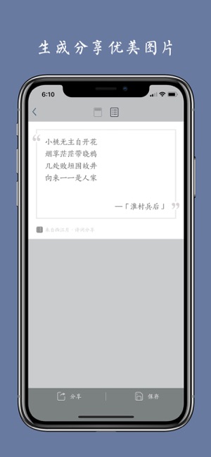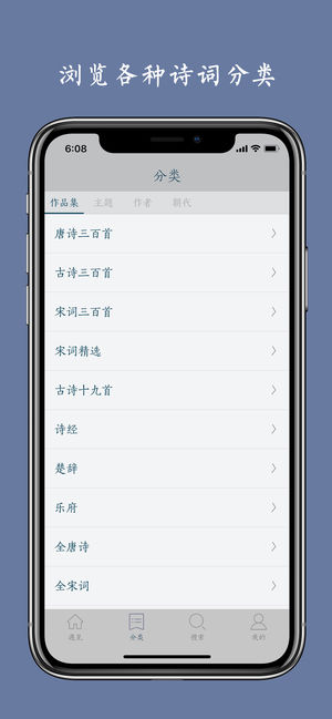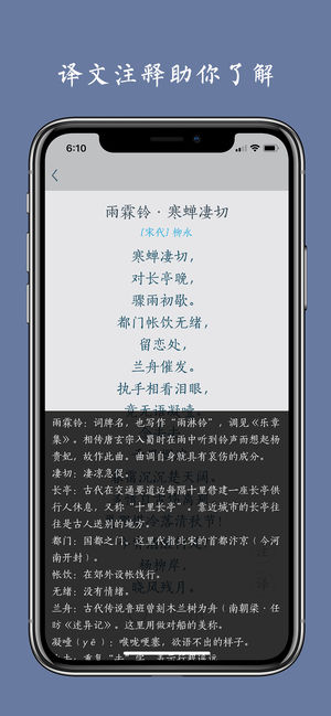 主要功能: ●每日推荐(早晨9:00),APP每天会推荐一首诗或一首词,潜移默化的学习古典诗词(记得允许西江月为您推送哦,除了每日推荐诗词,西江月绝不会推送其他东西打扰您)。 ●强大的本地搜索,如果有要查询的诗词,无论是根据作者、标题还是诗句,都可直接搜索查询,无需联网,只要你能想到的都能查到,做你的随身诗词大词典。 ●支持简体中文和繁体中文显示。 ●优美的诗词分享功能,遇到好的诗词就赶紧分享给好朋友吧。 ●注释与翻译一应俱全,数量逐步扩充中。 ●字词查询,遇到不认识的字又没有注释的情况下,可长按那个字或词进行查询(iOS 10 +)。 ●按朝代分类,按作者分类,按诗集分类,一应俱全。 ●坚决…