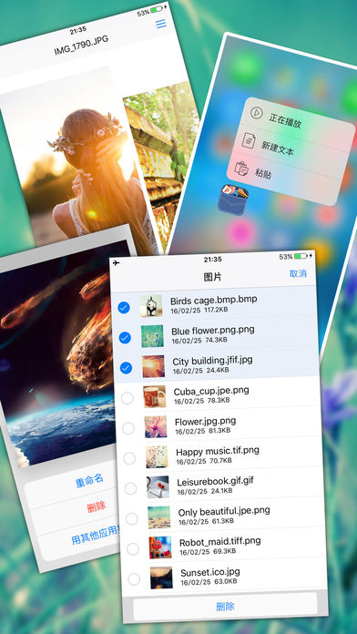 My Files是一款强大的本地文件传输、管理和保护工具,可在苹果设备、电脑之间随心所欲的传输图片、音乐、视频和文档。 使用My Files,您可以: 1)用指纹加锁保护自己的私密照片视频和机密文档 2)在手机上浏览各种图片、PDF、Office文档甚至RMVB/AVI等非苹果原生编码的视频 3)在手机上创建和编辑文本,轻松并安全地管理个人笔记 4)从其它应用分享文本、图片、视频、网页甚至地理位置到这里,得以安全地永久保存 5)将已经保存的照片、视频或者其他文档分享到其他的应用 My Files for iPhone的功能: 1.最安全的隐私文件 担心其他人有意查看你的个人隐私?My Files帮你说NO!Touch ID指纹识别,完美保护你的个人隐私。 2.方便快捷的文件传输 在苹果设备、电脑之间轻松的进行文件传输:传送一部高清电影只需几十秒,10秒钟就能传完整个音乐专辑,花1秒钟就可传送word、excel、PDF、PowerPoint等文档。想象一下这会多方便! 3.全面智能的文件管理工具 自动识别手机中的文件类型,轻松打开各种格式文件,现已支持的格式有: --音乐-- 常见格式: mp3, aac, wav 非原生格式: mpa, ogg, ra, ram, wma, wv 无损音乐格式: flac 以及各种罕见格式: aac, aif, aiff, au, m4a, m4r, aa, ac3, aifc, amr, dsf, mmf --视频-- 常见格式: mov, mp4, 3gp, m4v 非原生格式:, mpv, asf, avi, flv, mkv, mpg, rm, vob, wmv --图片-- 静态图片: bmp, gif, ico, cur, jfif, jpe, jpeg, jpg, png, tif, tiff, tga 动态图片: 动态gif --文件-- 压缩包格式: z, zip, rar 超文本: html, htm 普通文本: txt, text (支持带BOM头的UTF-8, UTF-16文本) 文档: doc, docx, xls, xlsx, ppt, pptx, rtf, csv 源代码: c, cpp, h, hpp, mm, m, js, json, css, php, java, log, xml 等 再也不用进行繁琐的格式转换,轻松一下,即刻阅读! 4.文件分享,快乐随行 My Files不仅仅可以轻松帮你管理文件,还能帮你把喜欢的视频、音乐、照片等轻松分享给你的社交工具,例如微信,微博和QQ。并且可以保存来自其他应用的分享。 5.文件管理也能3D Touch 当你看见喜爱的图片、文字时,轻松拷贝,在主屏幕的My Files图标上用3D Touch功能适度按压,就能快速粘贴,并且会帮你自动归类,永久保留,方便查看。 ...... 更多功能等你来体验!惊喜不断~~~
