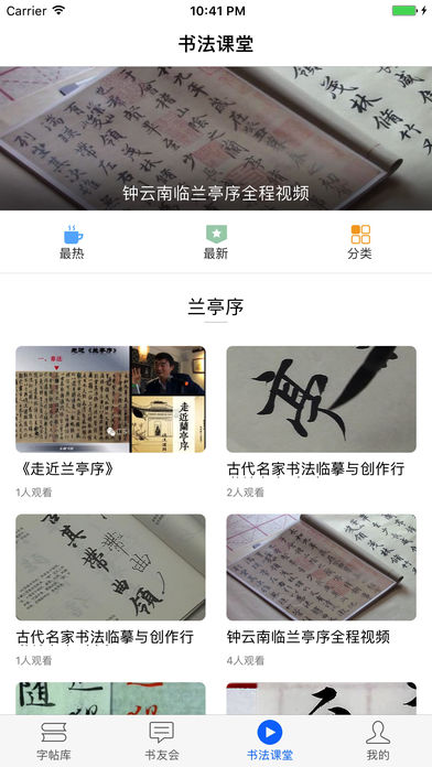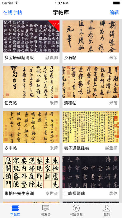 此VIP版App专有特权: 1.全部字帖CDN加速无限制下载; 2.VIP专区字帖下载; 3.专享去广告功能; 4.所有字帖,支持保存到系统相册中; 目前VIP专属内容有: *《兰亭集序》高清单字版 *《大唐三藏圣教序》高清米字格版 *《三希堂法帖》全册: 第一册 魏 锺繇荐季直表 晋 王羲之 快雪时晴帖 临锺繇千字文(传) 行穰帖 游目帖 瞻近帖 第二册 魏晋 王羲之 《袁生帖》《秋月帖》《都下帖》《二谢帖》《曹娥碑》 王献之 《中秋帖》《送梨帖》《新埭帖》《保母帖》 王殉 《伯远帖》 第三册 梁 武帝 《异趣帖》 隋 无名氏 《出师颂》 唐 欧阳询 《卜商帖》《张翰帖》 褚遂良 《倪宽赞》《临兰亭序》 冯承素 《临兰亭序》 颜真卿 《自书告身》《朱巨川告》《江外帖》 第四册 唐 孙虔礼 《书谱卷上》 第五册 唐 怀素 《论书帖》 柳公权 《蒙诏帖》 无名氏 《临右军东方先生画赞》 《王氏万岁通天帖》 五代 杨凝式 《夏热帖》 《韭花帖》 第六册 宋 宋太宗 《敕蔡行》 送高宗 《千字文》《洛神赋》 第七册 宋高宗 《付岳飞》《嵇康养生论》 《书苏轼地黄诗》 宋孝宗 《赐曾觐》 第八册 宋 李建中 《与齐古帖》《土母帖》 叶清臣 《近遣帖》 韩琦 《谢欧阳公帖》 范仲淹 《道服赞》《与秀才帖》 富弼 《与君谟帖》 文彦博 《得报帖》 欧阳修 《与端明帖》《与元珍帖》《修史帖》 第九册 宋 蔡襄 《与杜长官帖》《笔精帖》《精茶帖》《谢郎帖》《与当世帖》《与陈茂才帖》《与大姐帖》《进诗帖》《与彦猷帖》《与郎中帖》《与安道帖》《与宾客帖》 赵汴 《山药帖》 《名藩帖》 韩绛 《与从事帖》 韩绎 《与留守帖》 司马光 《与太师帖》 苏洵 《与提举书帖》 曾肇 《奉别帖》 曾布 《与质夫帖》 孙甫 《与子温帖》 沈辽 《与颖叔帖》 蒲宗孟 《与子中帖》 王觌 《平江帖》 林希 《与完夫帖》 陈师锡 《与方回帖》 ...... 更多内容还在更新中,赶快来看看吧 ************************************ 书法碑帖大全提供上千幅中华传世名帖下载,旨在为书法爱好者读贴练字提供最优质的服务。 书法碑帖大全有如下优势: •字帖下载无限制; •字帖内容高清:收录高清大图、支持超高清图片流畅加载、支持字帖无限制放大; •书法讨论区:书法爱好者可以在线交流书法学习中的经验技巧; •书法教学视频:编辑精选高质量教学视频、书法入门笔画结构、书法创作视频等等; 如果您喜欢书法,喜欢练字,那么请直接下载吧!! 为了给您提供更优质的服务,如您有任何建议、意见,都可以在App中的意见反馈留言,或Email:ripyueeq@163.com。