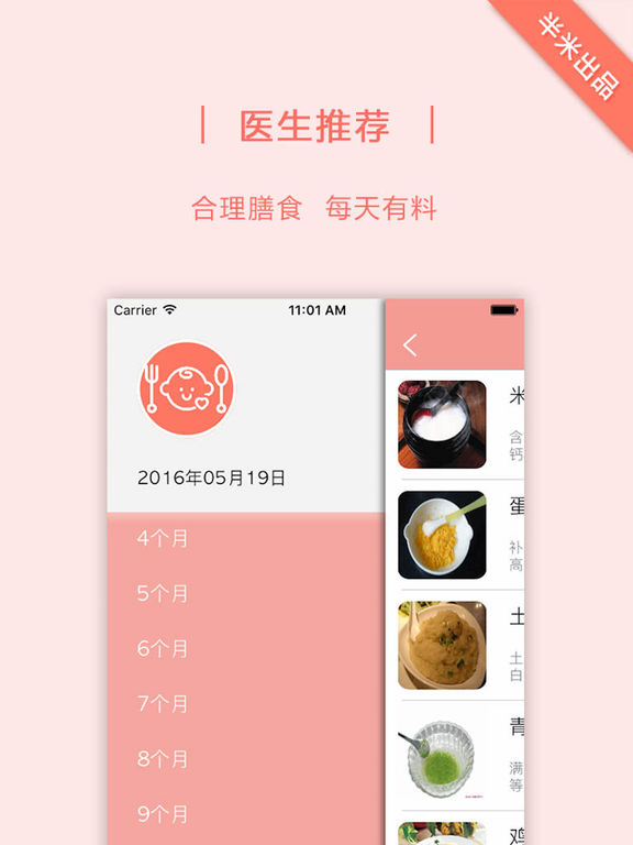 半米出品 宝宝食谱 医生推荐:营养均衡,简单操作! 为处在4到36个月的宝宝提供每日菜品,健康营养的饮食搭配,让宝宝健康成长没烦恼! 半米孕期app们陪伴您和宝宝的每时每刻~