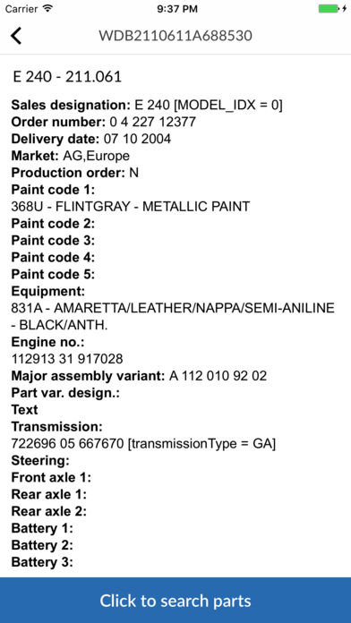 Mercedes-Benz Parts - This catalog of original and unoriginal spare parts for Mercedes-Benz Features of the app: - Search by VIN - Search car and body - Detailed information on auto parts - Codes of spare parts and their description - Detailed illustrations, diagrams of parts with the ability to save itself - Ability to copy source code Supported languages: English, Russian, Chinese, French, German, Italian, Japanese, Portuguese, Spanish, Turkish
