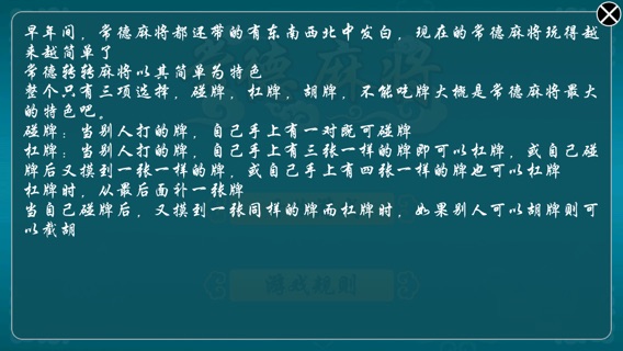 湖南伢子自己的工作室,地道的家乡味道,我们的理念是,要让每一个家乡的朋友都能在我们的作品中找到自己老家的味道,特别是让那些身在外地,甚至身处海外发展的老乡们,想家的时候消遣娱乐一下,听一听原汁原味的家乡话,打一打地地道道的家乡牌!同时希望愿意体验和尝试湖南味道的朋友乐在其中!祝愿所有外出的朋友,平平安安显身手;没有外出的朋友,健健康康展宏图! 游戏简介 早年间,常德麻将都还带的有东南西北中发白,现在的常德麻将玩得越来越简单了 常德转转麻将以其简单为特色 整个只有三项选择,碰牌,杠牌,胡牌,不能吃牌大概是常德麻将最大的特色吧。 碰牌:当别人打的牌,自己手上有一对既可碰牌 杠牌:当别人打的牌,自己手上有三张一样的牌即可以杠牌,或自己碰牌后又摸到一张一样的牌,或自己手上有四张一样的牌也可以杠牌 杠牌时,从最后面补一张牌 当自己碰牌后,又摸到一张同样的牌而杠牌时,如果别人可以胡牌则可以截胡