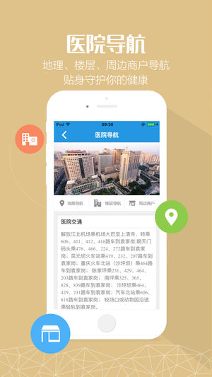 “重医一院”是由重庆医科大学附属第一医院研发的一款方便用户就医的智能手机应用。它能使用户方便挂号,无需请假排长队,查找医院方便简单,报告单查询随时看,健康状况一手掌握。 主要功能: 1、智能导诊:模拟医生问诊流程,通过自检初步评估自身病情; 2、实时挂号:实时更新医院号源情况,手机挂号省时又高效; 3、预约挂号:选择就诊卡,掌上预约,短信凭证就诊; 4、医院导航:院外线路导航、院内科室分布、周边商户一网打尽; 此外还有健康资讯、医院动态等实用功能,为您的健康保驾护航,提供专业便捷的移动医疗信息服务。 【声明】 重医一院是重庆医科大学附属第一医院与杭州卓健信息科技有限公司联合研发