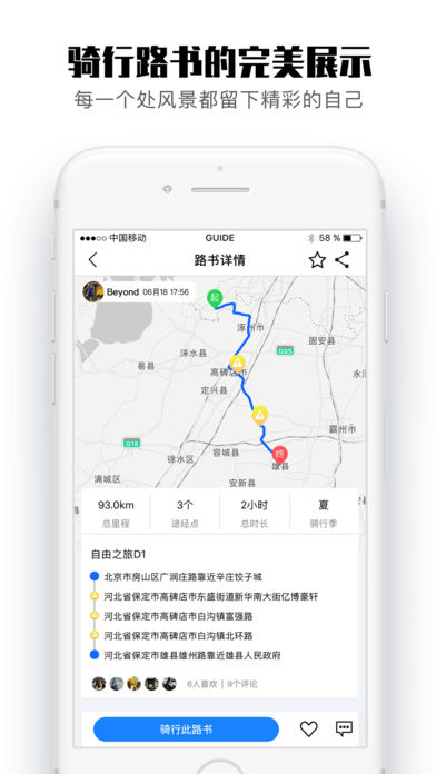 摩托Guide是一款专业摩托车工具app,提供详细的骑行数据记录,精品俱乐部发现平台,实时打点标记沿途风景,全国摩友长途骑行线路分享,关注摩旅达人实时交流骑行经验,打造简单易用的使用体验。 骑行中经常遇到的问题: -即使天天骑行, 却没能记录下来那些酣畅淋漓的骑行瞬间 -想要去摩旅,不知道去哪里,有没有不走高速的小道,有没有鲜为人知的美食 -出行前不知道准备什么装备,花费了多少 【摩托Guide】的解决方案 -精确当日骑行数据记录,并提供历史记录统计和峰值统计,生成轨迹回放视频,一键分享 -全国摩友根据骑行记录制作路书,标记特色景点美食,避开高速检查,分享适合摩托车骑行的路线 -整合出行装备,花费记录,离线地图使用小工具,做你随身的贴心小助理 -随时打点,标记难得好景,好物,好食,骑行见闻不再口说无凭 温馨提示: *当骑行结束后,请及时保存骑行记录并退出,这样可以节省电量及流量。 * 后台持续运行GPS会缩短电池寿命。 Continued use of GPS running in the background can dramatically decrease battery life.