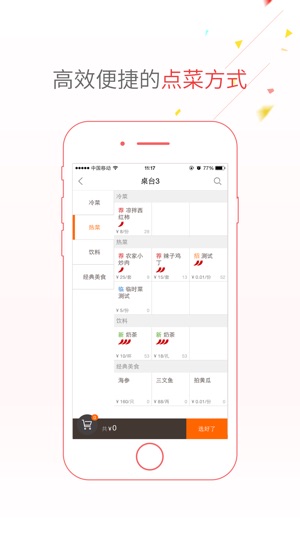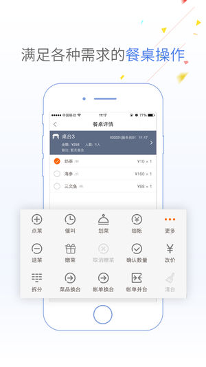 点菜宝是一款超智能的点菜系统,使用简单,极易上手。客服24小时免费指导。在点菜宝中可以完美实现桌台情况浏览、开台、点菜、下单、结账一整套的操作,极大的满足了各类餐饮领域的日常需求,大大降低了餐厅的运营成本,使服务员点菜更高效、更便捷、更准确。 【主要功能】 点餐:可以显示菜品的各种状态,通过编号,助记码和菜品名进行检索,高效点菜。 餐桌详情:除了有点菜、催单、划菜、结账这些传统的功能之外,我们还特别贴心的新增了改价、拆分、菜品换台、清台等新功能。 结账:为餐厅服务员贴心考虑了账单优惠、账单减免、会员卡功能、团购买单和各种支付方式,不用再向前台收银发送结账请求,提高了服务员的工作效率。
