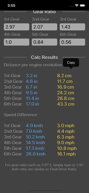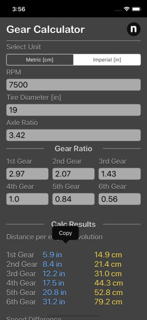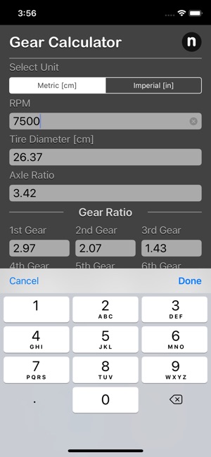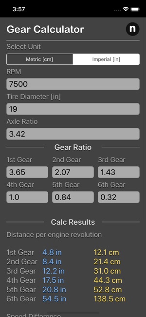 齿轮比速度计算器。 只需变速器,差速器,齿轮比和轮胎尺寸,就可以计算出车辆的速度,在特定的发动机转速和特定齿轮。 特征: 计算汽车每个齿轮比的理论速度。 计算每个发动机转速的行驶距离。 使用发动机转速来计算速度。 厘米或英寸单位供选择。 iPhone和iPad通用的应用程序。 如果汽车具有小于6的齿轮,只需输入适用的齿轮比率。 请注意,您获得速度为理论速度。这是因为在现实中的最高速度会被发动机功率和空气阻力所限制。