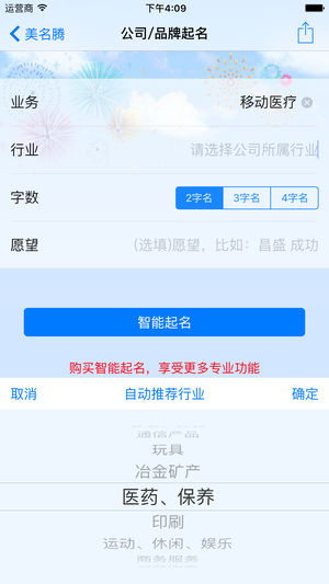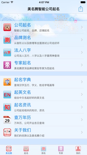 美名腾智能公司起名网是智能起名理念的开创者和领导者,让一个公司名字尽可能多的满足全方位的信息,使得名字更具文化内涵和时尚元素。可以完美满足公司所在领域特征、五格数理、诗词、成语、《周易》、《诗经》等古典元素。公司起名系统目前包含49个大领域,45,372个子领域;根据用户的心愿起名;形,音,意灵活变换;完美体现五格数理,数理大吉。美名腾公司起名工具是公司起名的集大成者。除了公司起名软件外,本软件还包括:公司测名,法人生辰八字查询,择吉万年历,公司起名字典,公司起名资讯等实用内容。 美名腾智能起名的优势: 1)独创六度空间起名法,传统和现代完美结合; 2)《诗经》、《楚辞》、《周易》、《论语》…