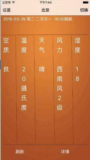 一款天气的软件,简单,实用 ,预报全面,文件小,适合只为看天气的人准备 使用指南---(1)经过再三考虑,页面设为手动刷新 (2) 本软件只支持中国天气,国外天气会后续添加 简约伴您同行,感谢您使用本软件,祝您生活愉快~~