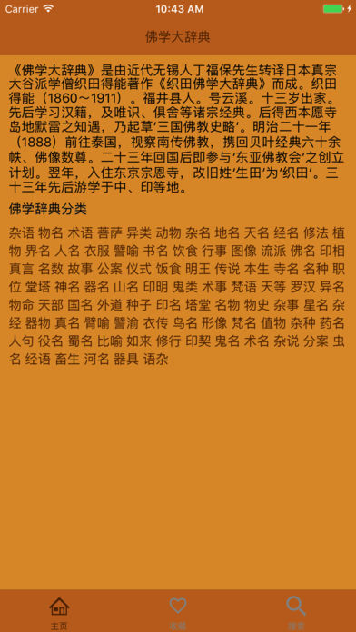 《佛学大辞典》是由近代无锡人丁福保先生转译日本真宗大谷派学僧织田得能著作《织田佛学大辞典》而成。 织田得能(1860~1911)。福井县人。号云溪。十三岁出家。先后学习汉籍,及唯识、俱舍等诸宗经典。后得西本愿寺岛地默雷之知遇,乃起草‘三国佛教史略’。明治二十一年(1888)前往泰国,视察南传佛教,携回贝叶经典六十余帙、佛像数尊。二十三年回国后即参与‘东亚佛教会’之创立计划。翌年,入住东京宗恩寺,改旧姓‘生田’为‘织田’。三十三年先后游学于中、印等地。