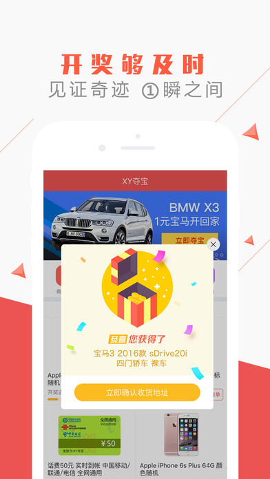 一元实现梦想,开走宝马汽车!直减红包火热来袭助力夺宝。 【友情提示】 夺宝平台众多且良莠不齐,为了您的财产安全,请选择具备完整资质的正规平台选购您喜爱的商品。 【一元无限惊喜】 新款手机、相机、笔记本、宝马汽车……那些你曾经纠结、犹豫、狠不下心买的高端时尚潮品,现在只需要在XY夺宝上花一元钱,就能轻松获得。 【全新夺宝玩法】 新增夜场专区,筹满即开,紧张刺激,无需等待。 【公正公正透明】 XY夺宝引入“老时时彩”数据作为计算参考数值,保证一元夺宝奖品众筹分配结果不可人为操控。获奖号码计算数据及计算方法完全公开,XY夺宝接受每一位用户的监督。 【精选全球潮品】 从手机汽车到黄金首饰,从零食美味到情趣用品,xy夺宝集合各种好吃好玩好看好用的时尚潮品,无论你是萝莉正太还是男神女神,在这里都能找到自己喜欢的商品。 【特别声明】 本应用所有活动与内容均与苹果公司无关,苹果公司既不作为赞助商也不以任何形式参与。