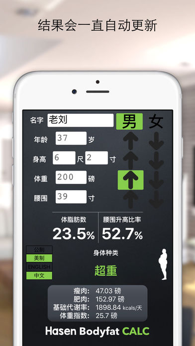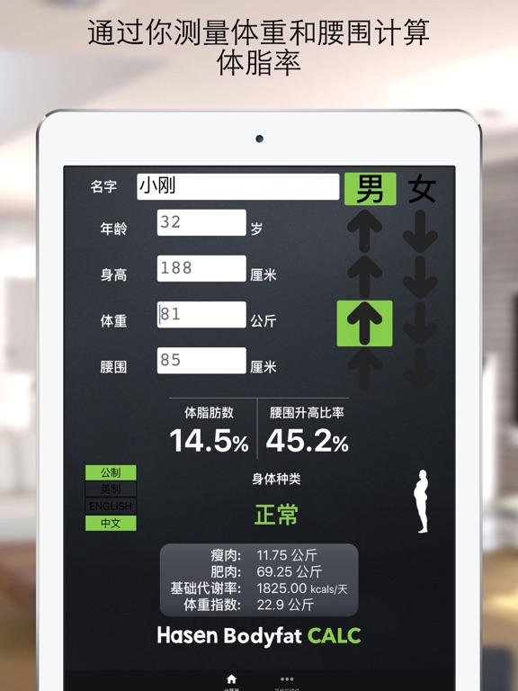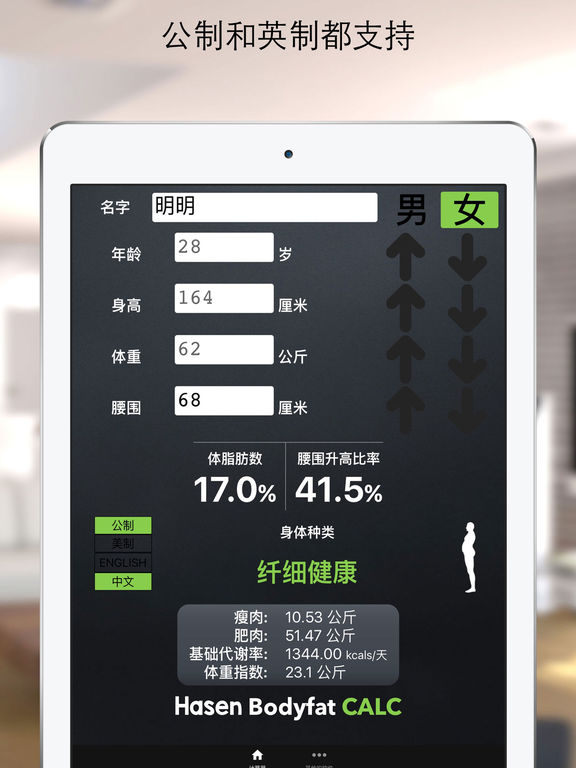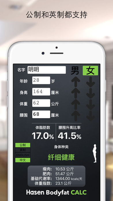 ** #7 中国 健美健康 排行榜! 如果你想减肥或者想长肌肉,你当然需要一个很准确又简单地的计算方法来量你的肌肉和脂肪。通过这个软件,你只需要量你的腰围和体重你就可以计算你的身体脂肪数 - 就这么简单!没有那些繁琐的事情,像量体脂肪数的卡尺和你的大腿,脖子什么的。 就量腰围和体重就可以给你准确的体脂肪数结果。 会显示根据腰围升高比率 (WHR) 和体脂肪率总体种类。为了相对比较 体重指数(BMI)也会显示。 其他的功能包括: - 基础代谢率(BMR)这是你身体每天基本热量需求 - 你的肥肉和瘦肉都会显示,以便你能够看到你身体比例确实是肥肉 - 公制和英制的系统都支持并且很容易更换 - 体脂肪率种类 - 你按键的时候结果自动更新!没必要每次按一个计算按钮才能看到结果,像其他的体脂肪数计算器软件 - 又直观即友好 - 体脂肪率和腰围升高比率总体种类 - 确体重指数(BMI) - 中文和英文都支持 - 享受的输入朋友、家人以及明星的身体数值,去发现他们的体脂肪数! - 可以从磅和公斤,寸和厘米互相转换