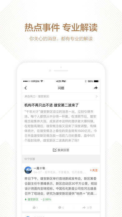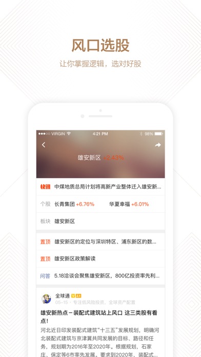【内容提要】 以主题、风口为切入点,通过大数据筛选,为A股股民提供风口下精品观点内容。让投资学习、热点把握、精准选股,变得通俗易懂、直来直去、高效实用。 -最有料的主题投资干货都在这里! 大数据筛选,汇集最干货、最对口的观点内容 -不错过任何主题下的快讯消息! 准!准!准! 快!快!快! -你关心的投资消息,都有专业的解读,让你轻松Get投资逻辑! 专业团队帮你分析,1分钟读懂消息背后的投资逻辑 【应用功能】 汇集投资达人、基金经理、公司高管、专业分析师、资深业内人士,各路投资精英观点,帮你轻松了解风口个股那些事。 大盘研判、政策解读、板块变化、个股分析,各类投资机会挑出来。高手浅显直白的分析,帮你精准把握要点。 精选7x24小时快讯,甄别热点事件,把握风口风向,投资机会不再遗漏。