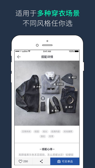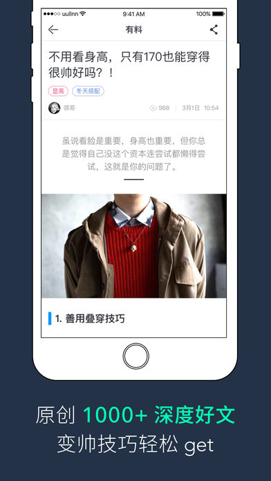 天气骤变没衣服穿?工作&约会没衣服穿?每周重复穿那两套太乏味?170m如何搭配才能穿出180m的感觉?想要变风格不知从何下手? 那就来有领吧,解决你的一切穿衣烦恼! 春季新品时时更新,不用脚,只需动动小手指!就能买到合心的衣服! 有领主要定位在省时省事上,帮助不会买衣服的汉子们快速买到时尚又合适的衣服。不用众里寻衣N多度!更不用满大街找衣服!大改一入淘宝看花眼的窘状! [可以穿.有货] 我们只覆盖高品质的服装,小编精选好货,深挖优质店铺。 [怎么穿.有料] 我们只写关于男人们的精神食粮,让你神不知鬼不觉涨姿势。 [穿什么.有谱] 不同场景和不同风格的穿衣搭配方案,想穿什么就穿什么, 街头潮流、欧美日韩、文艺简约、商务休闲应有尽有! [好评如潮] 学生党与工作汪的喜爱的十大实用穿衣搭配App -------联系我们-------- 官方网站:http://www.uullnn.com/ 微信公众号:有领uullnn 有领变帅QQ群:497447157 邮箱:service@uullnn.com