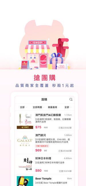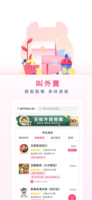 澳覓,澳門人的本地生活服務平台,合作商戶2000+,註冊用戶70萬+ 「產品特色」 吃喝玩樂全在行: 澳覓外賣,覆蓋全澳2000+餐廳,不進廚房,不出家門,澳覓專送為您快速送達; 套餐優惠,品質團購1折起,在線支付優惠更多,工銀澳覓聯名卡享更多實惠; 澳覓秒殺,每週五上午10:00準時推出,為您打造精緻生活,更多優惠等你來; 澳覓優選,精選全球好貨,美好生活觸手可及。 「特色功能」 搜羅附近外賣美食,極速訂餐 澳覓專送快速送餐,隨時呼叫 智能刪選排序餐廳,方便下單 各種贈飲打折活動,貼心優惠 外賣美食照片點評,吃出信賴 下載澳覓App,暢享指尖生活
