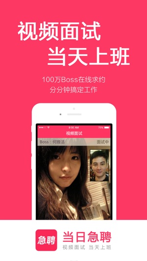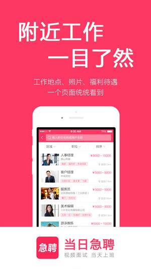 全国高薪急聘,每日更新! 招聘、求职、找工作必备神器! 【当日急聘】 覆盖全国的各大行业,真实靠谱的招聘平台,通过视频面试等方式,实现24小时极速上班! 基于地理位置,寻找附近靠谱的好工作或人才,和企业老板、直接手机面试, 最快当天上班!急招人、急找工作的必备神器! 当日急聘,重新定义手机招聘! 招聘求职找工作最新神器,老板直招,视频面试,当天上班,可以寻找同城全职或兼职、实习的工作机会! 严格监督招聘行为,让求职者找工作找得放心! 【高薪工作,每日更新】优选全国各服务业连锁品牌薪酬最高的招聘岗位,让招聘方和找工作的求职者都能看到最新更新的招聘信息 【视频面试,当天上班】手机电话、语音…