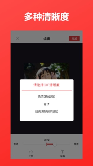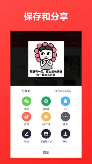 支持的功能: 自定义制作gif 通过拍摄视频制作gif 能够调整gif的速度 发送gif给“微信好友” 发送gif给“微信朋友圈” 支持删除自己制作的gif 可以制作有趣的连贯图片 也可以制作电子相册 简单易用 快来分享给你的好友吧