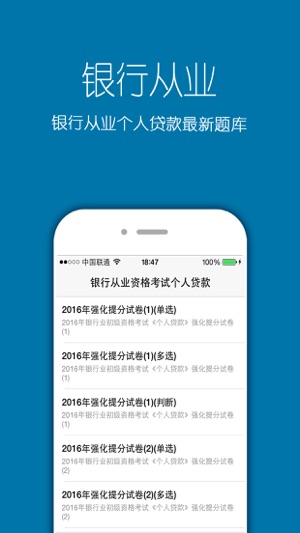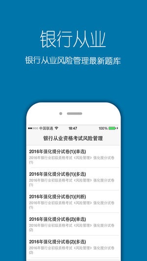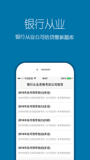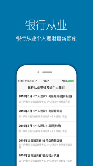 应用介绍: 针对银行从业资格考试所制定的专业辅导软件,为从业考试学员提供法律法规与综合能力 ,个人理财,风险管理,个人贷款,公司信贷的题库。 真题解析——历年真题解析,押题好伴侣 离线使用--无广告,无需网络,方便便捷。 法律法规与综合能力 2016年银行业初级资格考试《法律法规与综合能力》真题汇编(一) 2016年银行业初级资格考试《法律法规与综合能力》真题汇编(二) 2016年银行业初级资格考试《法律法规与综合能力》专项冲刺(1) 2016年银行业初级资格考试《法律法规与综合能力》专项冲刺(2) ....... 2015年银行业初级资格考试《法律法规与综合能力》预测试题(1)…