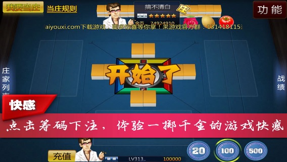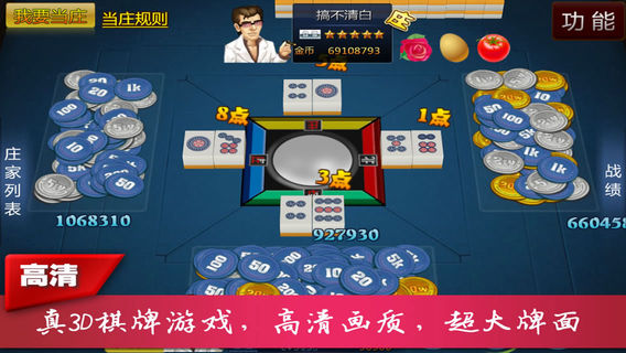 比大小是一款比拼运气和胆量的游戏。 游戏使用麻将中的1-9筒和白板共40张牌,每盘向庄家和南、西、北三家各发两张牌; 玩家可以向南、西、北三个方位投注,然后与庄家进行比牌。牌点大的获得胜利。 在游戏中,可以点击左侧的“申请上庄”按钮成为庄家。 牌型大小:对子>天杠>散点