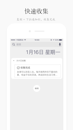 多次获得最美应用、AppSo、爱范儿、小众软件、利器、少数派等知名媒体强烈推荐 ◆资料收集利器,碎片阅读必备,半秒完成收集! ◆从任何APP瞬间收集文字、网址、图片、视频以及任何有用的灵感,无需切换。 ◆还能通过云端实现 #Web #iOS 同步。 ◆语音识别记事,灵感不会丢掉。 ◆从您的微博、微信、朋友圈、QQ、短信、阅读器、浏览器…任何应用中收集灵感和知识。 ◆与在线网站/电脑浏览器版 方片 实时同步。知识、笔记轻松共享。 ◆每条收集都能备份到印象笔记以及其他云存储空间。