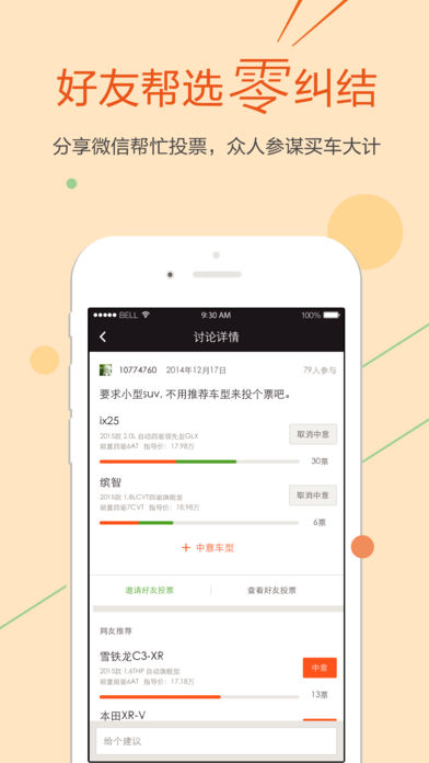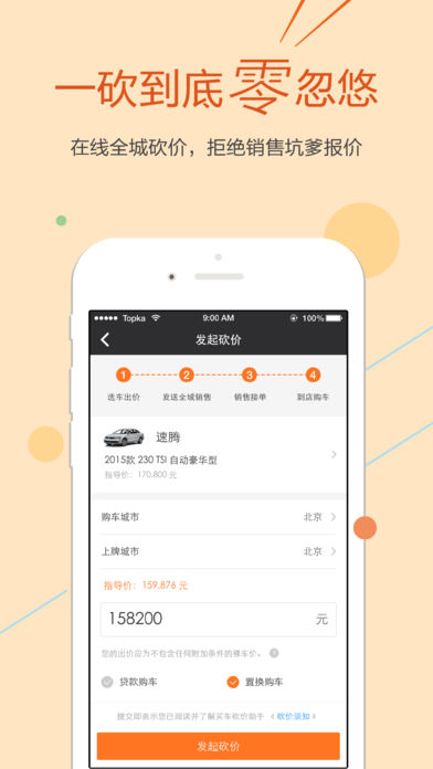 买车砍价必备神器。 颠覆传统的购车方式,轻松实现底价高效购车。 专业购车顾问全程服务,国内最赞的买车砍价应用。 买车全城砍价:在线与全程销售顾问砍价,效率高的不得了; 成交权益保护:双方成交支付保证金,买卖双方权益有保障; 线下轻松提车:到店直接提车,开启汽车生活。 亮点介绍 【选车无忧】选车不用犯难, 专家帮您搞定。 【全城砍价】全城销售砍价, 帮你底价买车。 【权益保护】成交支付保障金,保证销售不忽悠。 【到店提车】到店直接提车, 高效便捷靠谱。