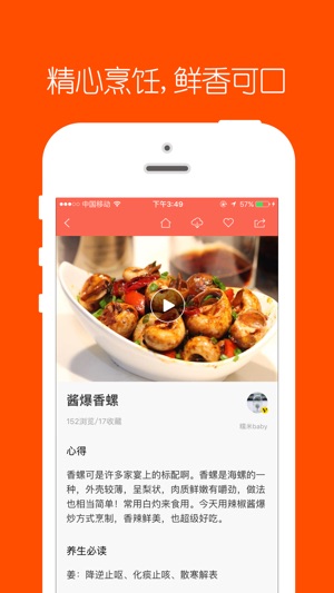 城市的繁忙让我们的生活变的零碎,一天三顿的快餐让舌尖上的乐趣也慢慢变淡,我们变的孤独没有安全感。 突然十分想念每天回家,远远就闻见家里的菜香味的感觉。那是家的味道。 周末了,让我们慢悠悠的为自己做道小菜,让自己慢下来,享受一道道食材在我们手中变成无可替代的美味。让这种幸福感包裹我们渐渐孤独的内心。 无论多忙,都要为自己做道菜。无论多忙,都要为ta做道菜。 让家的感觉,包围在我们周围。 我们的主要功能: 超过十万到精选菜谱,完全免费,每天更新! 图文和视频,分布详解,让你轻松成为家中大厨! 完美的收藏和离线功能,完全不需要再耗费流量! 热情洋溢的美食圈,让您分享交流自己的故事,自己的美味;…