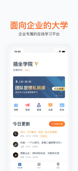 企业培训,效果第一。好多课APP由插坐学院团队推出,专注于企业在线培训服务。目前累计上线课程超过8000节,服务超过30万在线学员,覆盖超过1.5万家企业。 官方微信:插坐学院( ID : chazuomba )联系邮箱:ichazuo@ichazuo.cn
